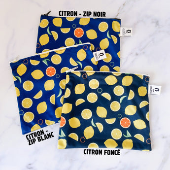 Ni trop grand, ni trop petit, ce format moyen est idéal pour les collations gourmandes, les petits sandwichs ou les petits objets. Léger, souple, lavable et rapide à sécher, il vous suit partout!